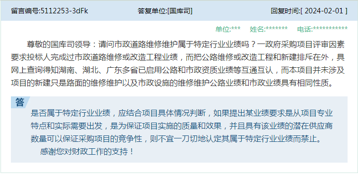 11★、问★★:尊敬的国库司领导★★:请问市政道路维修维护属于特定行业业绩吗?一政府采购项目评审因素要求投标人完成过市政道路维修或改造工程业绩,而把公路维修或改造工程和新建排斥在外★,具网上查询得知湖南★★★、湖北、广东多省已启用公路和市政资质业绩等互通互认★★★,而本项目并未涉及项目的新建只是路面的维修维护以及市政设施的维修维护公路业绩和市政业绩具有相同性质。
