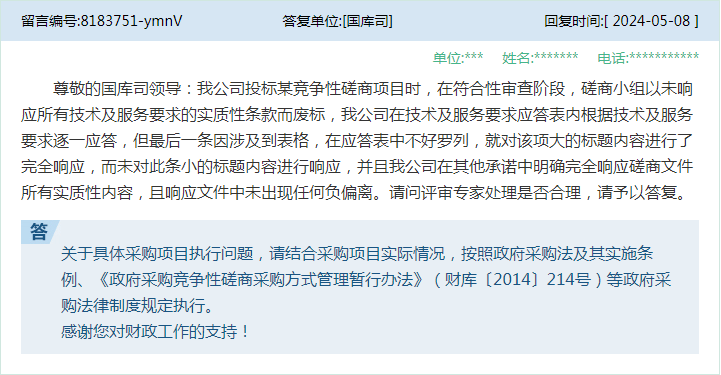 7、问★★:尊敬的国库司领导:我公司投标某竞争性磋商项目时,在符合性审查阶段★★★,磋商小组以未响应所有技术及服务要求的实质性条款而废标★,我公司在技术及服务要求应答表内根据技术及服务要求逐一应答,但最后一条因涉及到表格,在应答表中不好罗列,就对该项大的标题内容进行了完全响应,而未对此条小的标题内容进行响应,并且我公司在其他承诺中明确完全响应磋商文件所有实质性内容,且响应文件中未出现任何负偏离。请问评审专家处理是否合理★★★,请予以答复★★。