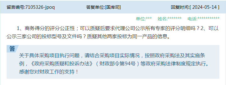 答★★:关于具体采购项目执行问题,请结合采购项目实际情况,按照政府采购法及其实施条例★★,《政府采购质疑和投诉办法》(财政部令第94号)等政府采购法律制度规定执行。