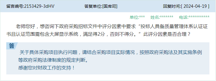 15★★★、问★★:老师您好,想咨询下政府采购招标文件中评分因素中要求“投标人具备质量管理体系认证证书且认证范围需包含大屏显示系统,满足得2分,否则不得分。”此评分因素是否合理?