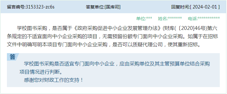 13、问:学校图书采购★★★,是否属于《政府采购促进中小企业发展管理办法》(财库(〔2020]46号)第六条规定的不适宜面向中小企业采购的项目,无需预留份额专门面向中小企业采购。如属于在招标文件中明确写明本项目专门面向中小企业采购,是否可以质疑代理公司,使其重新招标。