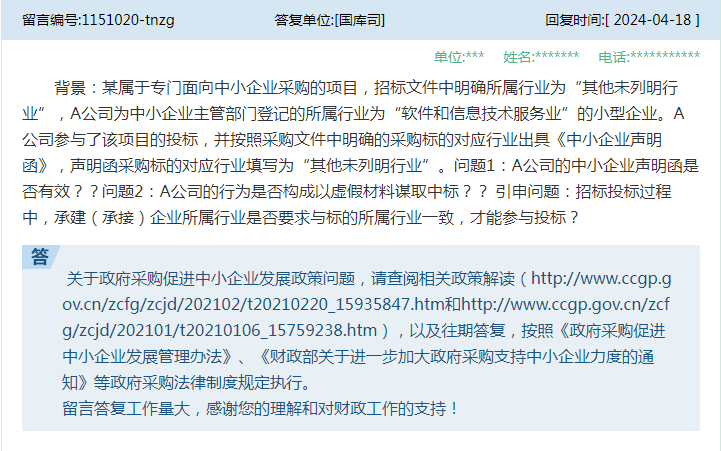 5、问:背景★★:某属于专门面向中小企业采购的项目★★,招标文件中明确所属行业为★★★“其他未列明行业”,A公司为中小企业主管部门登记的所属行业为★“软件和信息技术服务业★★”的小型企业★。A公司参与了该项目的投标★★★,并按照采购文件中明确的采购标的对应行业出具《中小企业声明函》,声明函采购标的对应行业填写为“其他未列明行业”★★。问题1:A公司的中小企业声明函是否有效?★★?问题2:A公司的行为是否构成以虚假材料谋取中标??引申问题:招标投标过程中★,承建(承接)企业所属行业是否要求与标的所属行业一致★★★,才能参与投标★★★?