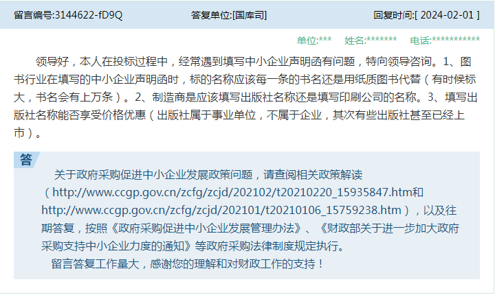 14、问:领导好,本人在投标过程中,经常遇到填写中小企业声明函有问题,特向领导咨询。1、图书行业在填写的中小企业声明函时,标的名称应该每一条的书名还是用纸质图书代替(有时候标大★★,书名会有上万条)。2、制造商是应该填写出版社名称还是填写印刷公司的名称★。3、填写出版社名称能否享受价格优惠(出版社属于事业单位,不属于企业,其次有些出版社甚至已经上市)。