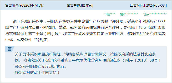 6、问:请问在政府采购中,采购人在招标文件中设置”产品贡献“评分项,磋商小组对所投产品品牌生产厂家对体育事业的捐赠、赞助、冠名等方面情况进行综合评分,是否属于违反《政府采购法实施条例》第二十条(四)项”以特定行政区域或者特定行业的业绩、奖项作为加分条件或者中标★★、成交条件“的规定。