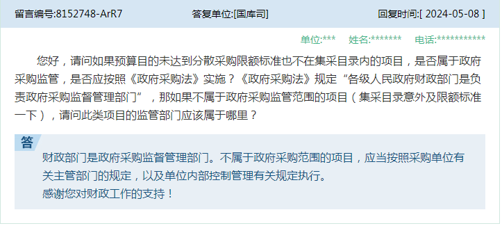 8、问:您好★,请问如果预算目的未达到分散采购限额标准也不在集采目录内的项目★★,是否属于政府采购监管,是否应按照《政府采购法》实施★?《政府采购法》规定“各级人民政府财政部门是负责政府采购监督管理部门★★”★,那如果不属于政府采购监管范围的项目(集采目录意外及限额标准一下),请问此类项目的监管部门应该属于哪里?